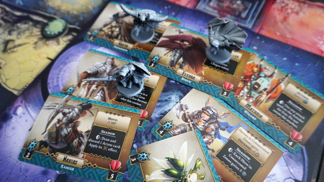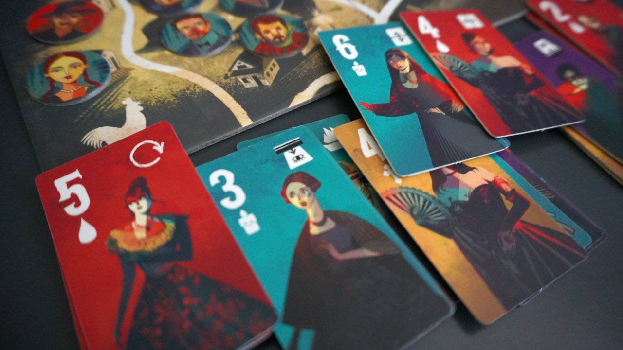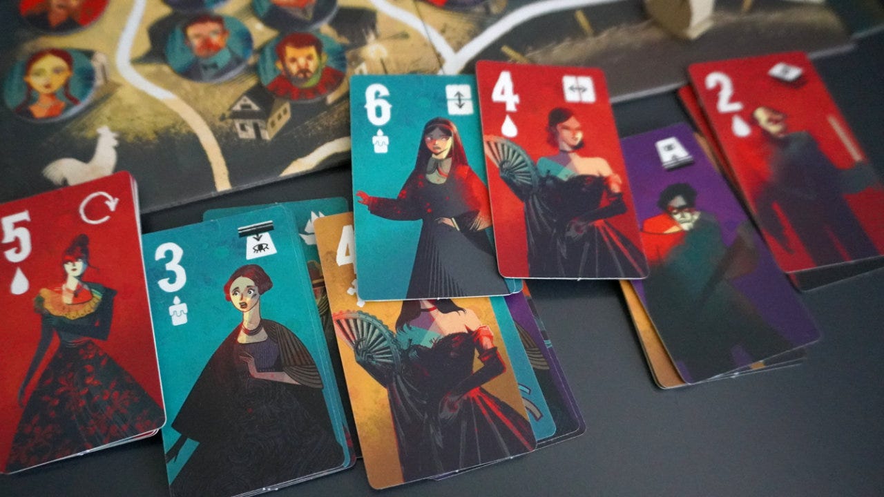 Over the course of five rounds, the two players use a shared deck of cards and largely the same rules. It’s a hidden information game, with each side having five cards lined up with districts on the map. The goal is to have the highest value (or trump card) in each lane at the end of the round. Winning a line advances the player’s path to victory.