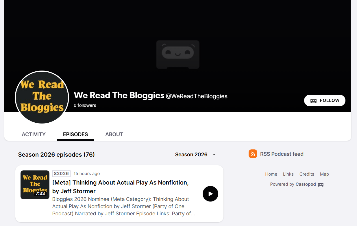 Also, check out the amazing We Read the Bloggies project that was put together by the people at the Prismatic Waystation Discord server — a monumental effort to get every nominated blog posted as a podcast episode. I recorded readings of both Playing the Chaplain’s Game and Everything is Pointcrawl.