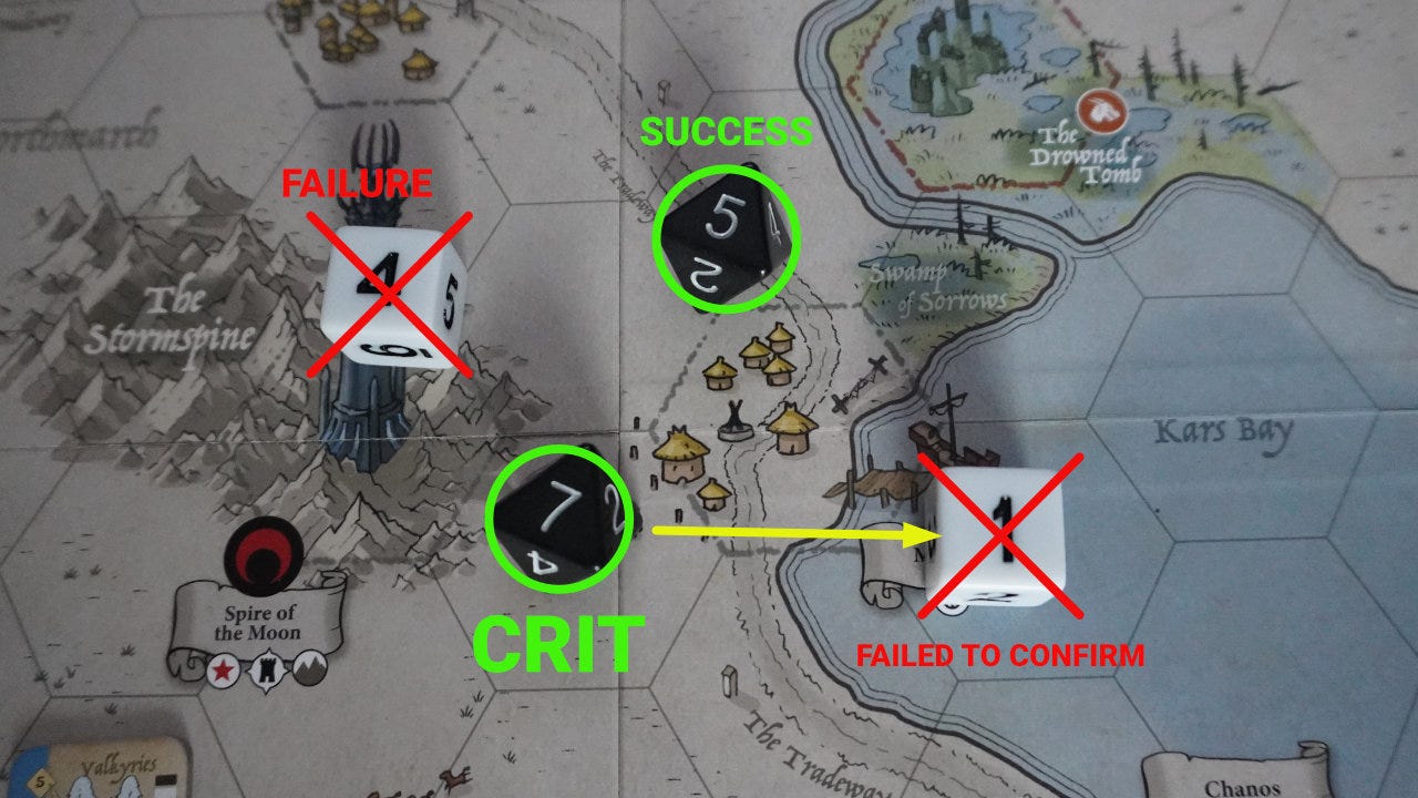 Die results of 7+ during combat count as both a success and a critical hit. This can only happen, of course, on the black d8 dice and never on the white d6 dice. There is about a 25% chance of rolling at least a 7+ on a d8.