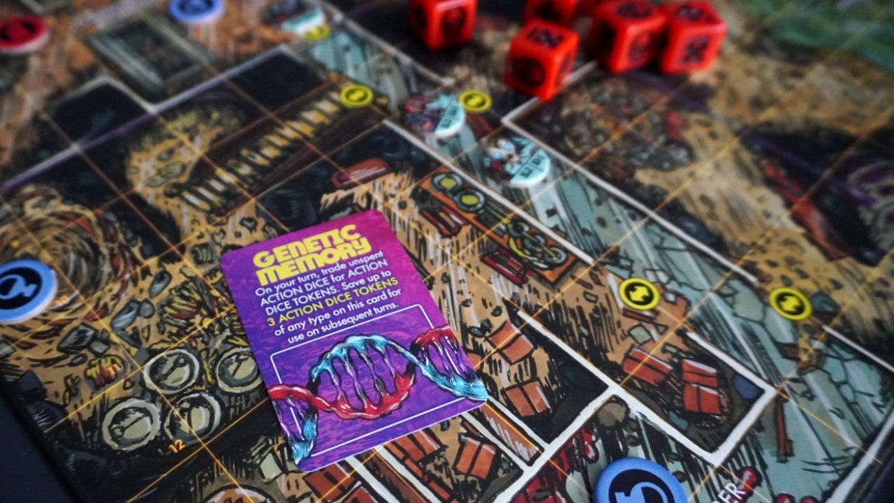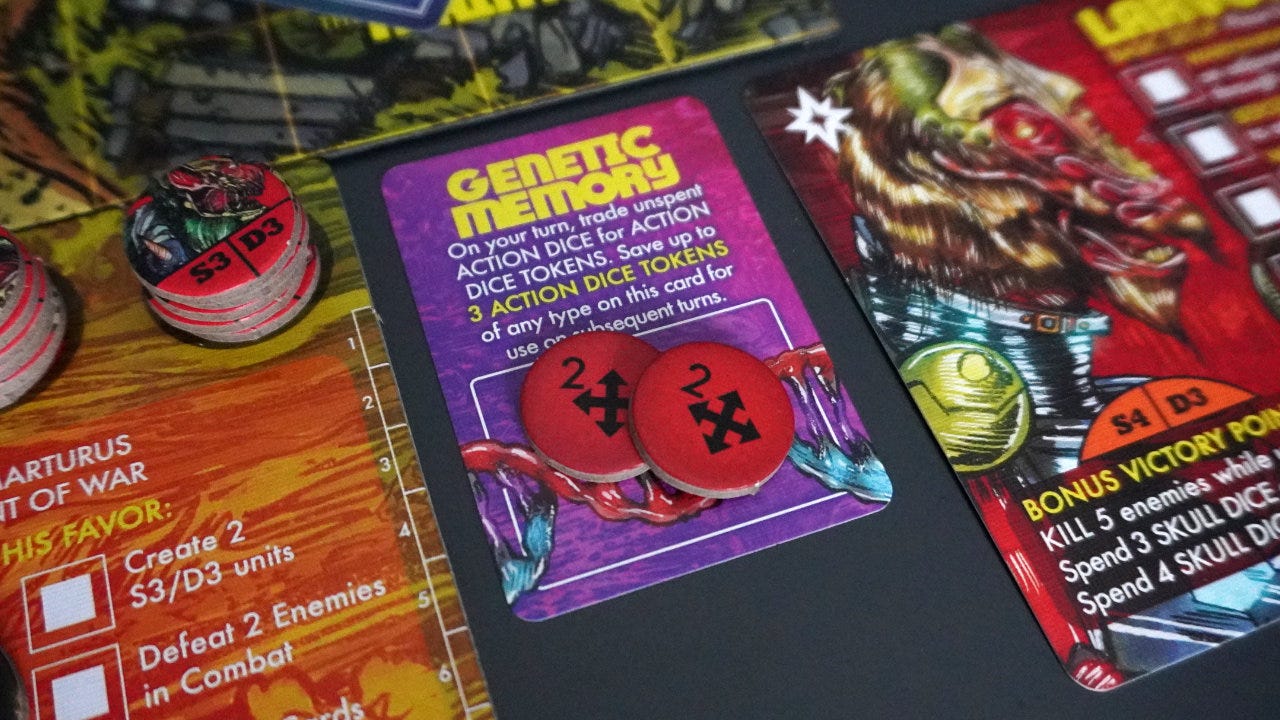 Adding player agency: While not a strict rule, I think it’s a good design method to look at each part of a game and ask (1) is there player agency and (2) can the player be given a choice.4 The genetic memory mechanism does this by allowing the player to choose not to use the dice and save them for a later turn. This can be a tough decision at times.