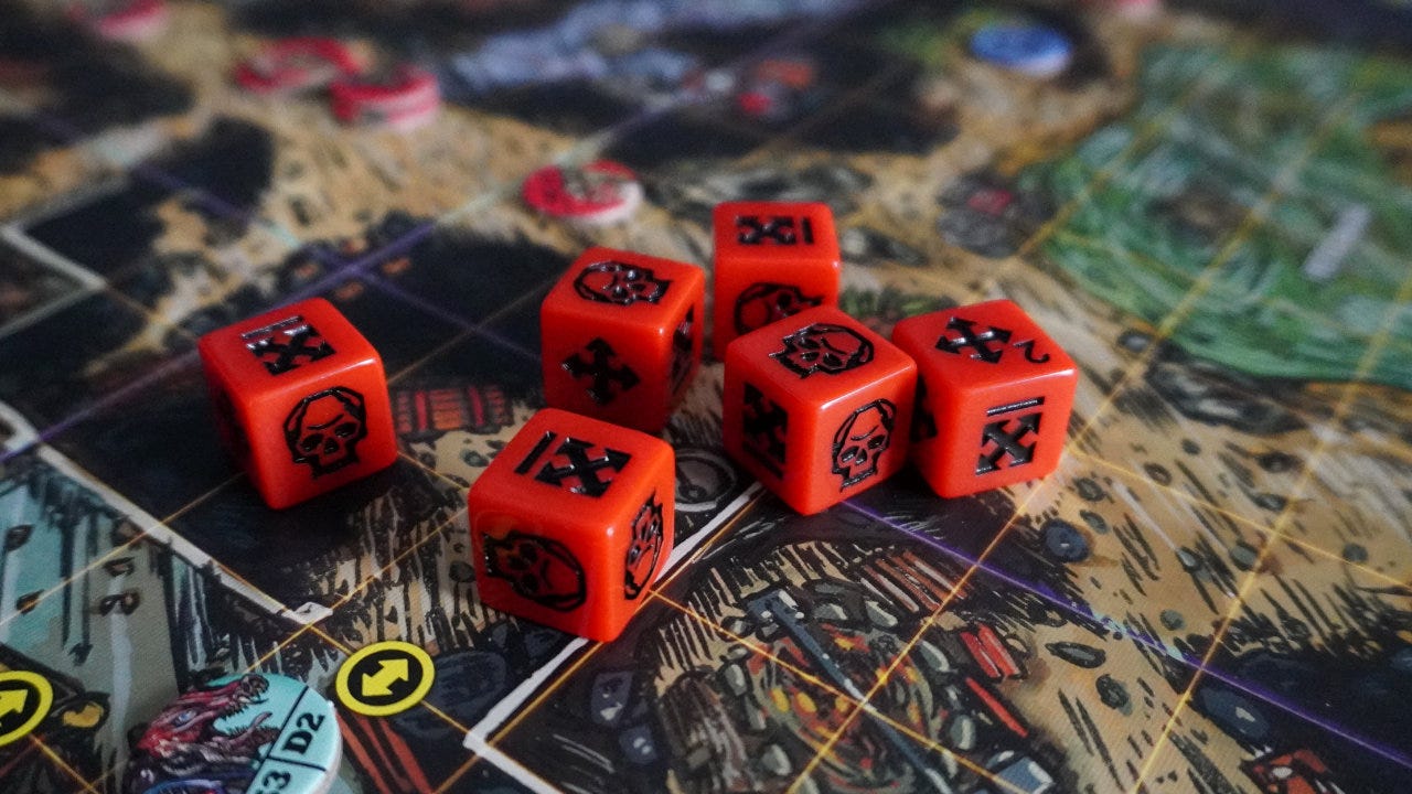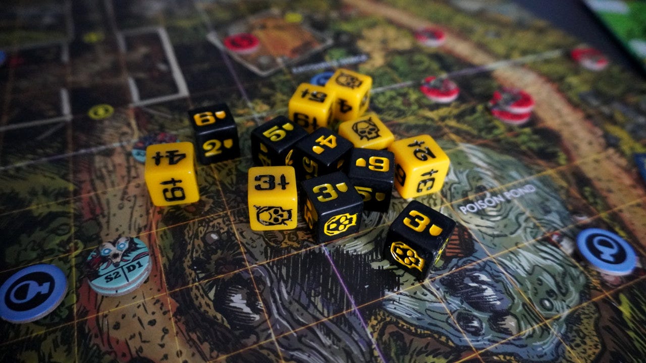 Exploring the use of action dice in Dark Venture: Battle of the Ancients and how tokens are used to mitigate luck and increase player agency.