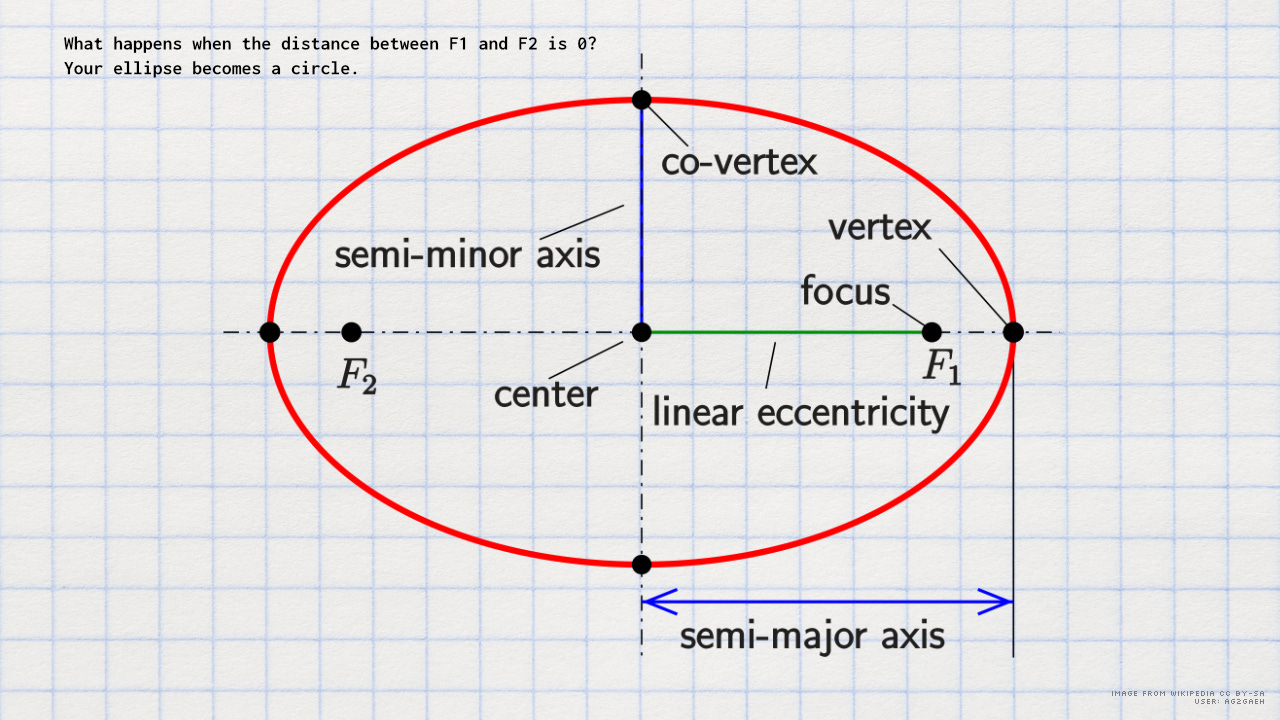 When we reduce that distance to zero (i.e. the two focal points have the same location), it becomes a circle — the limiting case of an ellipse.