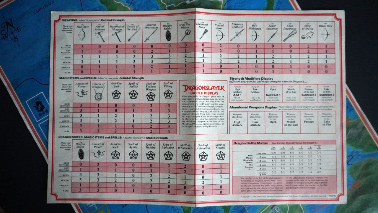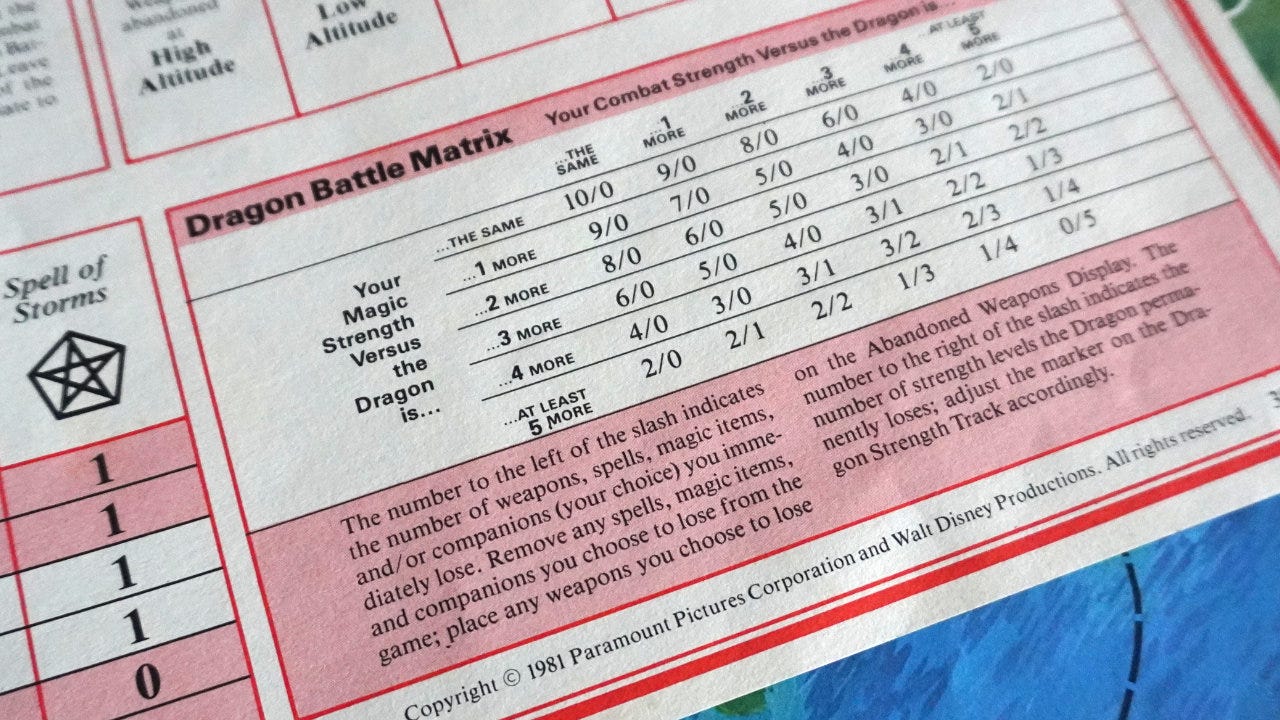 Combat and magic values are calculated based on the dragon’s location and the type of items being used. Then are cross referenced on a combat results table, because this is an SPI game.