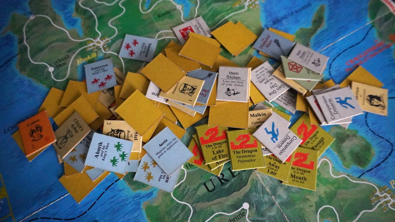 Players take on the roles of one of four available magicians (Galen, Merridyds, Old Kyvin, and Aurric), traveling around a map of Urland. Hamlets and towns have small tiles (face down) that contain weapons, magic items, or game effects. Each turn, players can take three actions (called “days” in the game) which usually involve moving to a location, collecting the tile, and moving to the next location.7