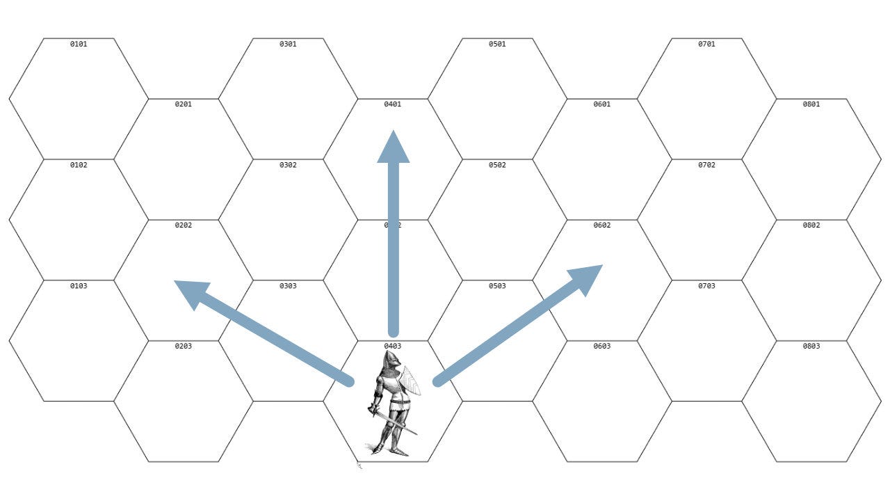 No restriction in movement direction. Other than designed obstacles (e.g. an impassable mountain hex), players can move freely in six directions.