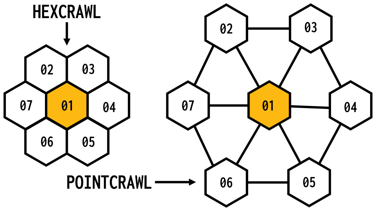 Hex and point crawls have much in common: While it’s amusing to say that hexcrawls are actually pointcrawls without the lines, there is some truth that there are similarities. Players are moving between locations via allowed (legal) connections. Hexes typically have six outbound connections (faces) while points can have an arbitrary number of outbound connections.