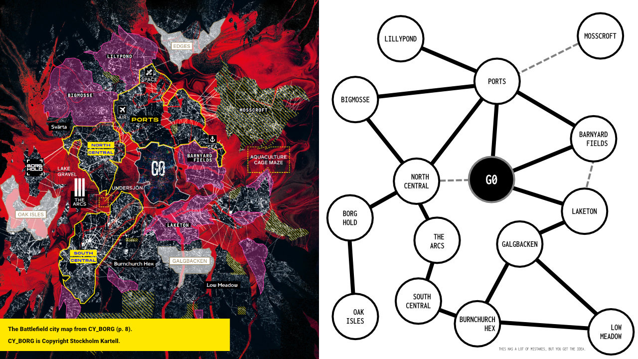 With Risk, each area can just as easily be represented by a dot connected to others by simple lines. We could do the same thing with the six areas in Pacts (Brin, 2025) or the city map in CY_BORG. In all three cases, however, it would strip layers of theme out of the game in an undesirable way.