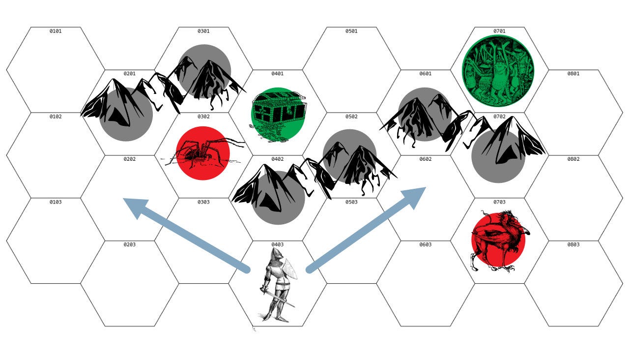 In the examples above, the player has no information by which to choose one hex versus another on their way to the target hex. All adjacent hexes are equally good or bad before their contents are revealed. The consequences are determined by output randomness when rolling dice to see what is found after moving. This could also be true for a pointcrawl with nodes that aren’t defined until the player explores them.