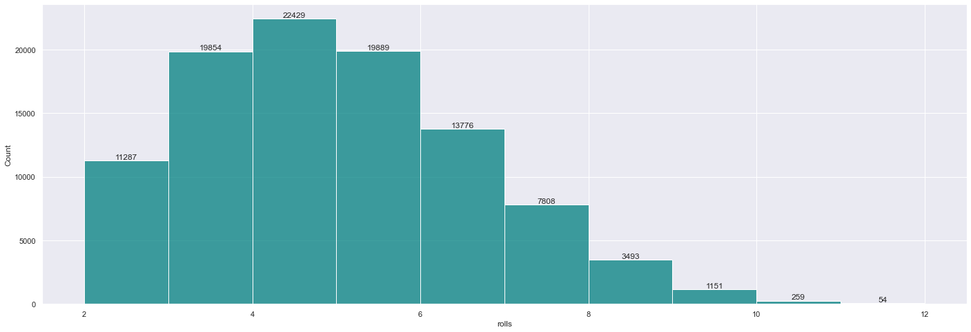 The chance of busting after one roll is zero, of course. Jumps way up at two rolls, and then three and four. After that, there’s a decreasing chance of ever getting to the higher number of rolls. It’s unlikely you’d be that person with the 54 in 100,000 (0.054%) chance of getting to 10 successful rolls and then busting on the 11th.