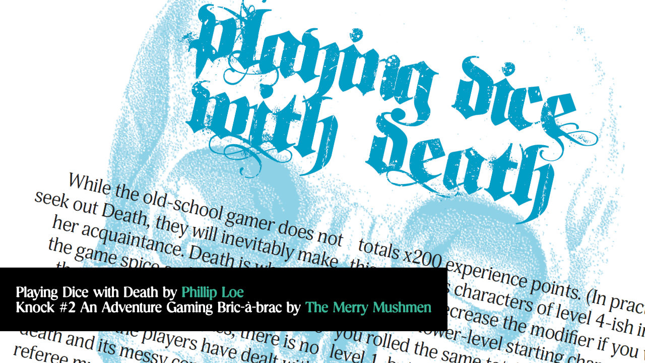 In a three page piece called Playing Dice with Death, Phillip Loe describes a system to respawn new characters in old-school TTRPGs (where they might be prone to early deaths). It addresses the question of how high of a level should the new character begin. The solution is to make it a mini-game vs. Death!