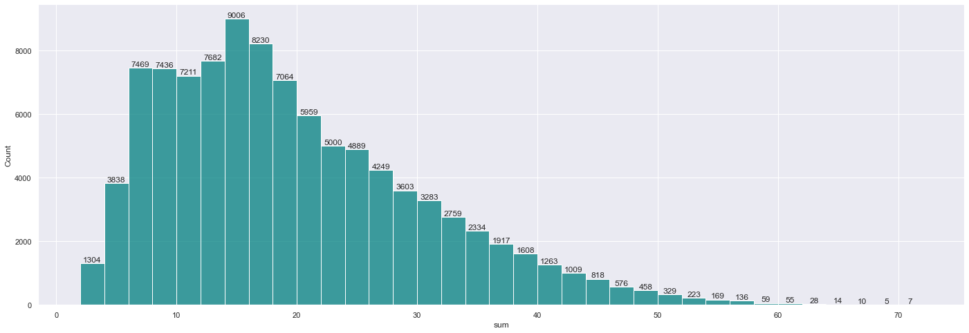 Here’s the histogram plot for the sum you’d walk away with if you stopped right before busting (N=100,000):