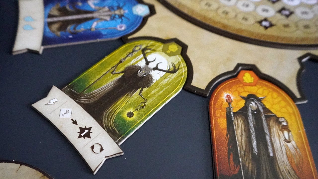 Although I haven’t played many similar games, I know that grid-based activation systems have been used before. What I found interesting was that in Rauha, the player didn’t control which rows or columns were activated. Instead, it was a fixed rotation controlled by the Avatar token’s clockwise movement around the player boards. The player agency was entirely focused on drafting cards and playing them into the grid.