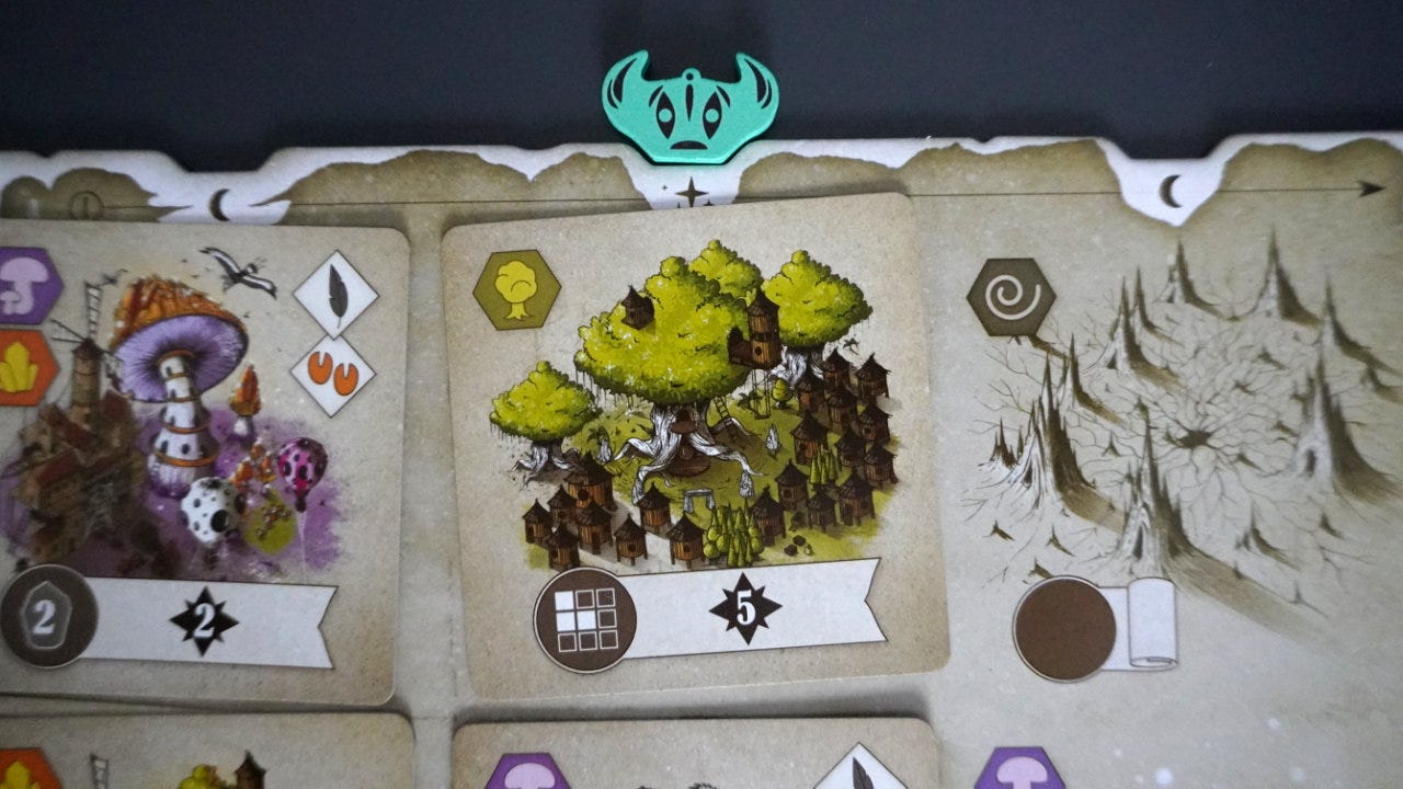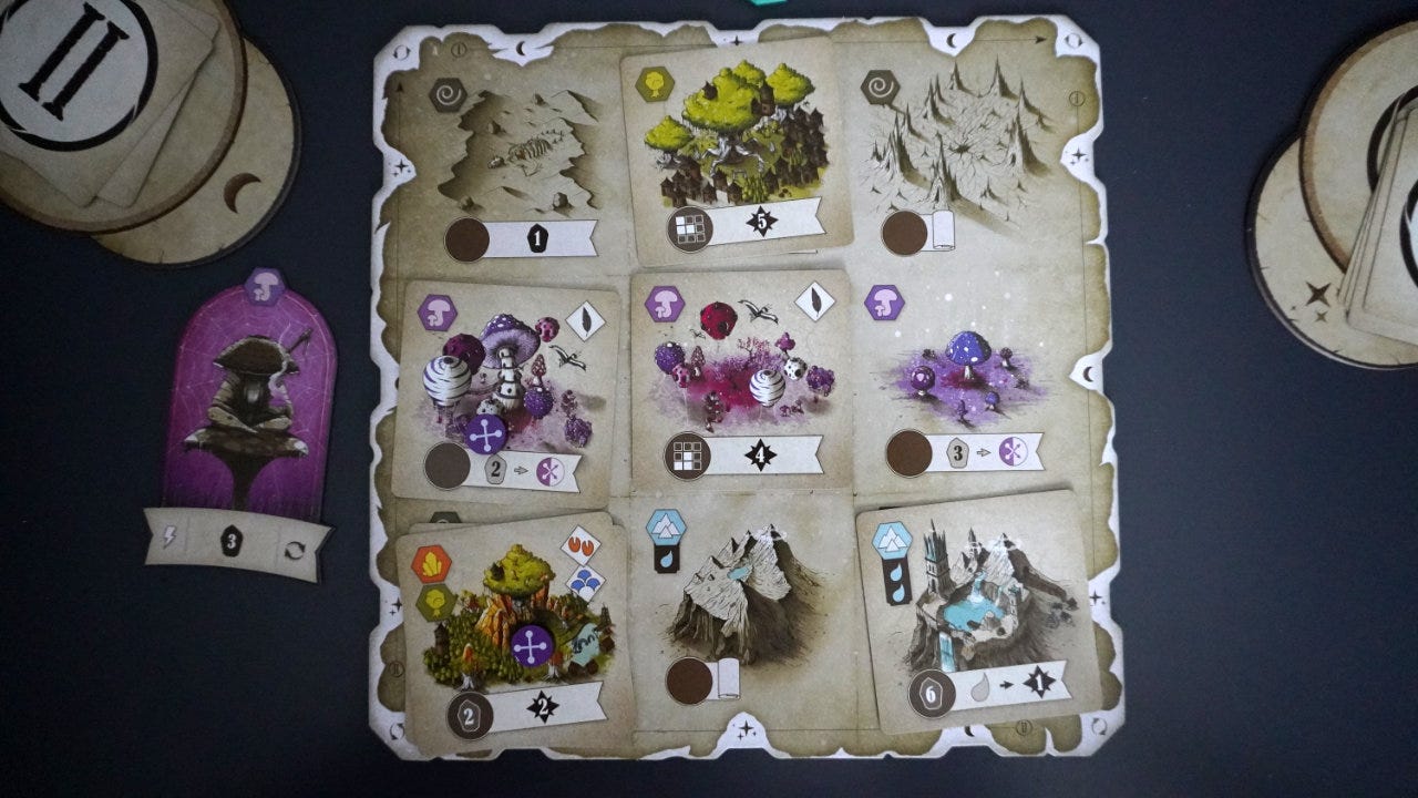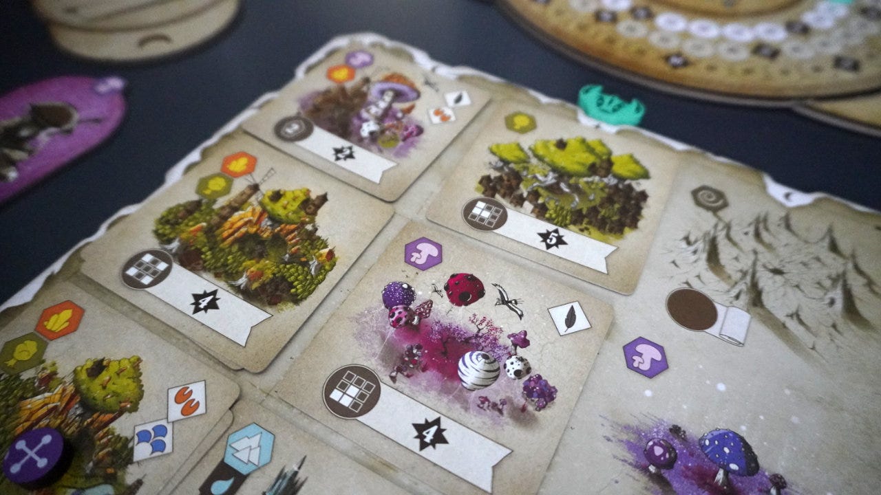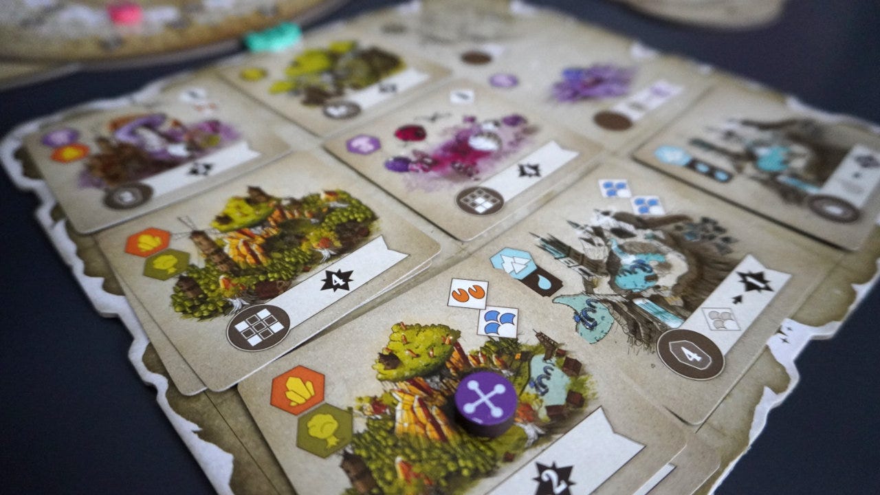 In general, players are trying to choose cards that act as upgrades to their starting biomes.3 Cards are placed anywhere on the grid, covering up any starting biomes or previously played cards. This creates some interesting pattern-building choices: