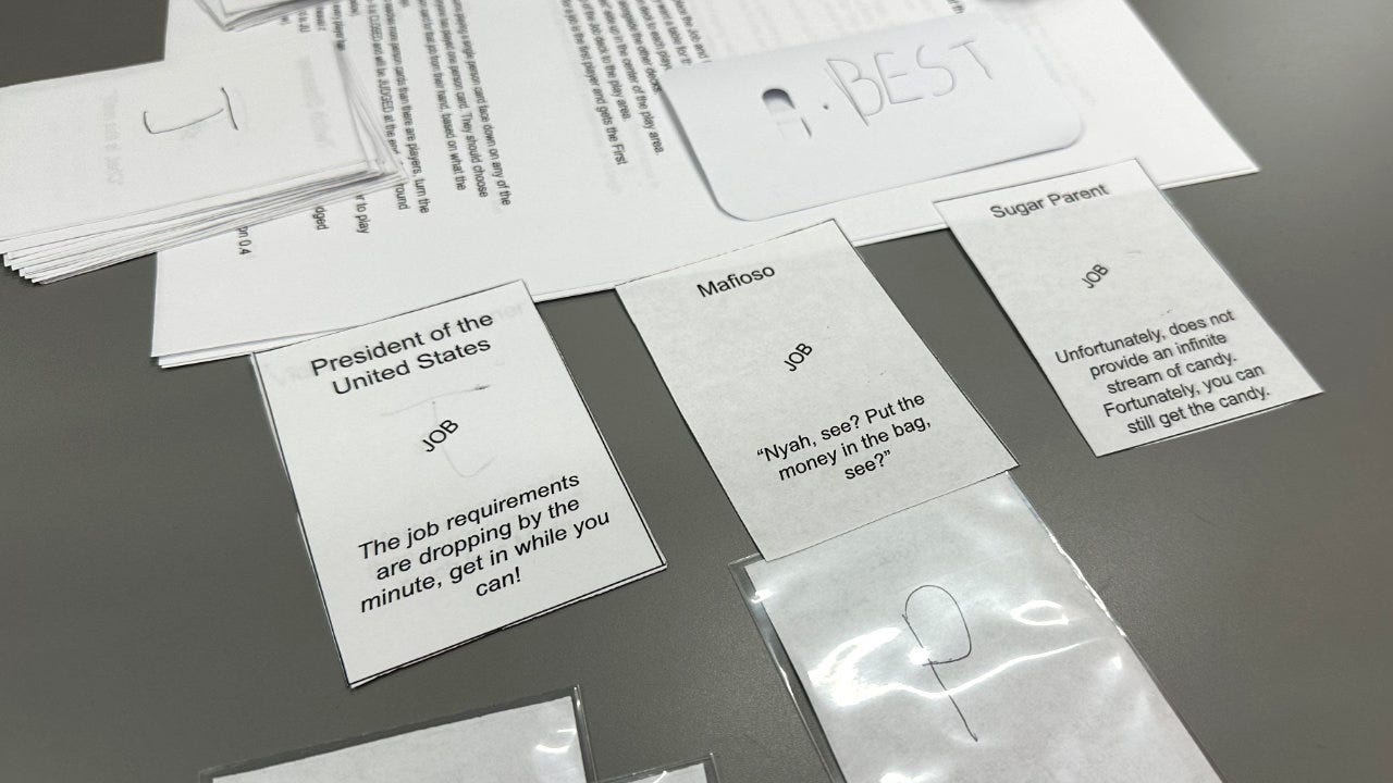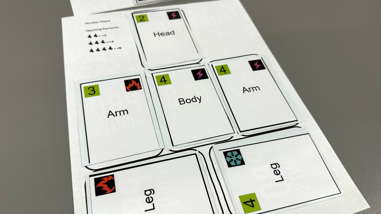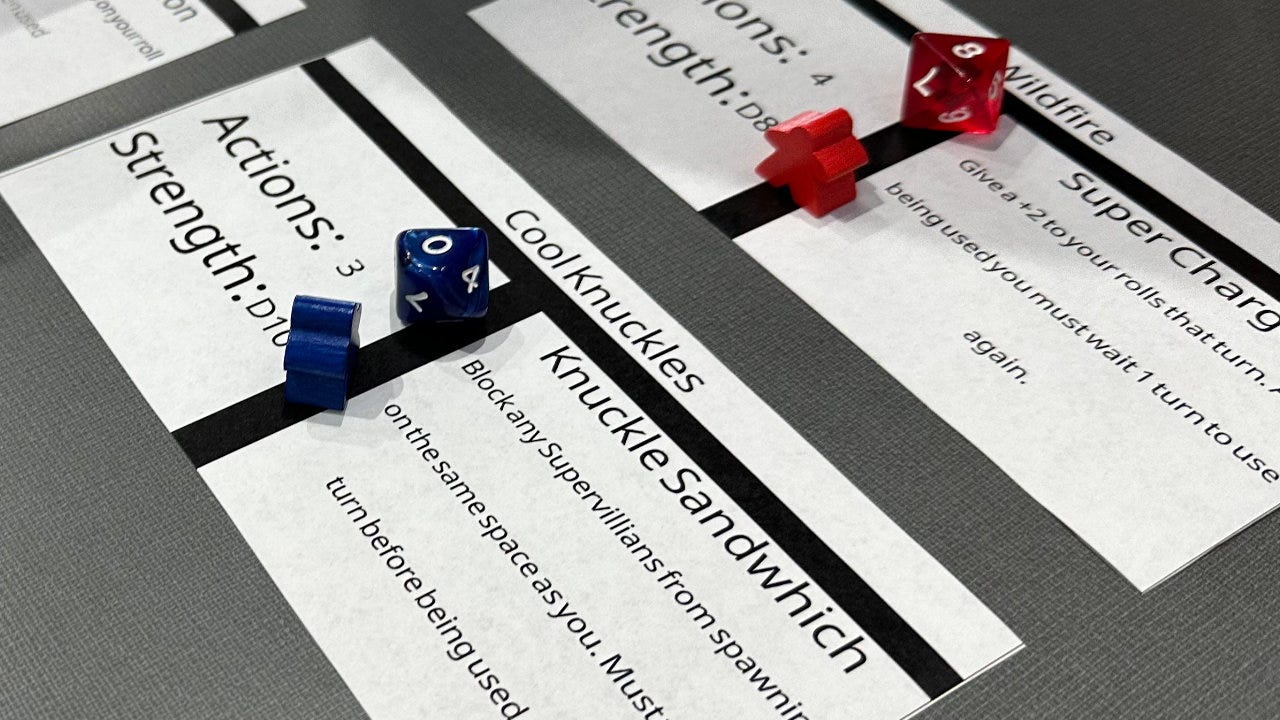Not everyone has the same vision abilities. Take it easy on your testers and make text on cards, boards, and other components large and easy to read. It’s OK to have handwritten bits, but as someone with rather poor handwriting, get some assistance from someone who can write clearly.
