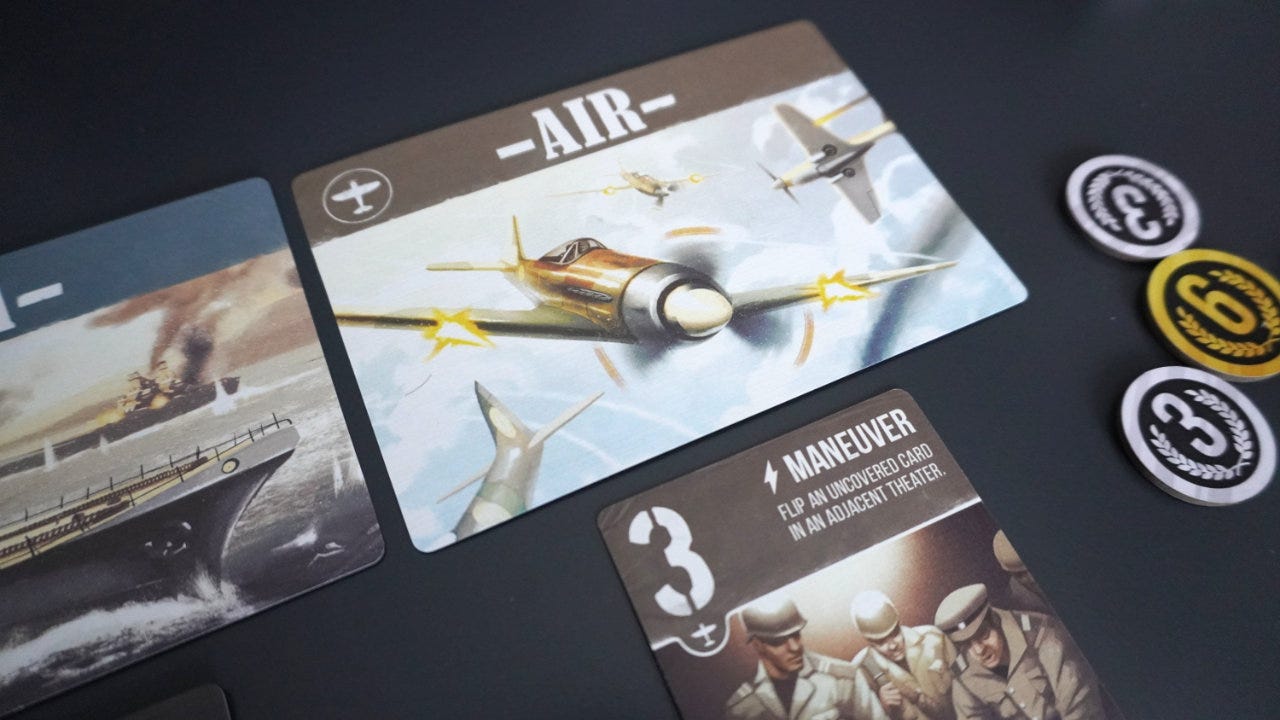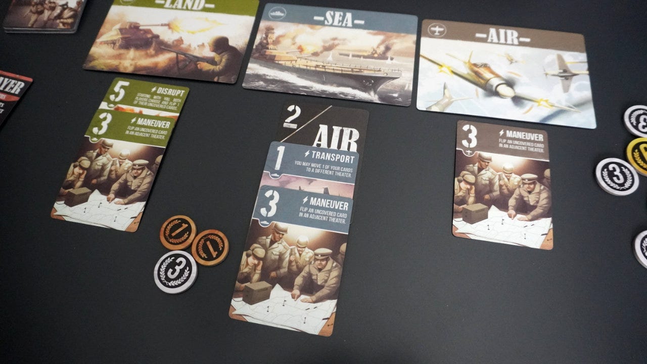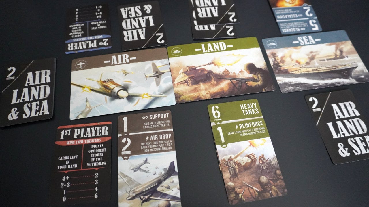 Two players sit across from each other with three “theaters of war” cards in a line between them: Air, Land, and Sea. Each player is dealt six cards, each tied to one of the theaters much like a card suit. The cards also have a numerical strength and sometimes have a special ability that is triggered when played. For example, the Transport (Air, Strength 1) card has the ability: “You may move 1 of your cards to a different theater.”