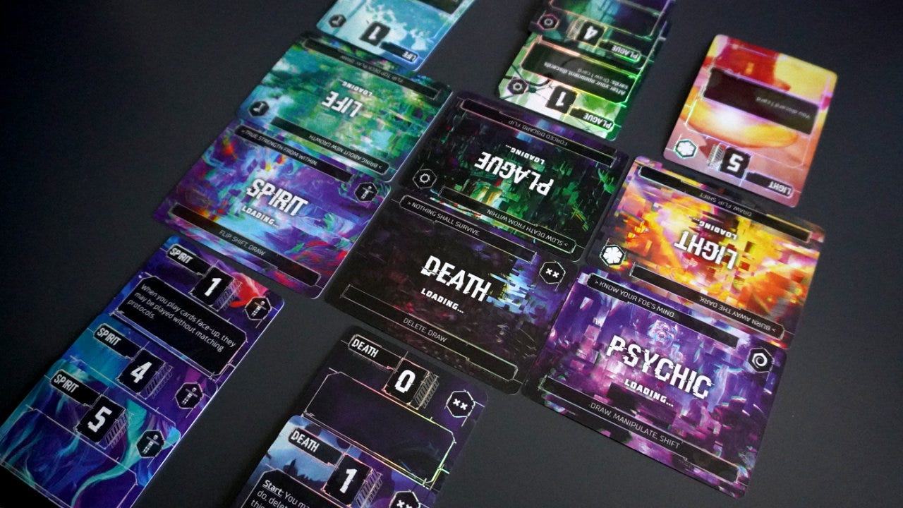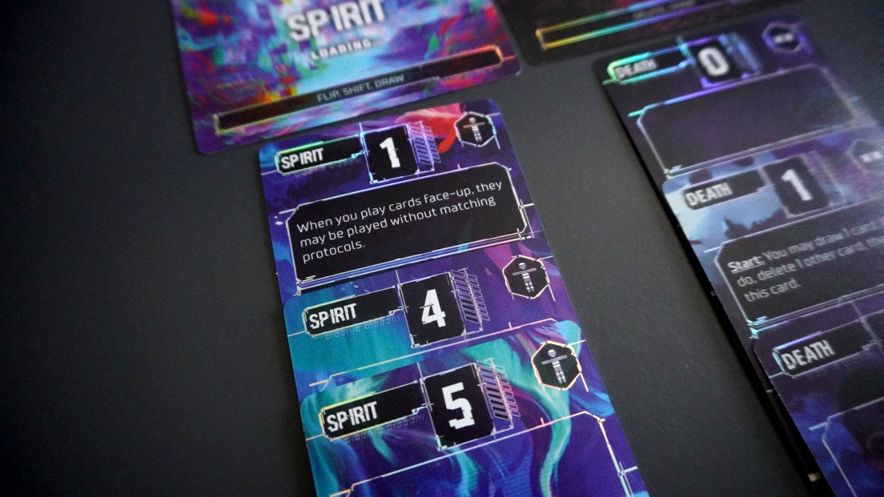 In the case of Compile, however, each lane has two types or labels versus just one like in Air, Land, & Sea. For example, a Compile lane might be both Spirit and Life which allows either suit to be played into that lane. Also, the ability to shift/swap the lanes is a key part of the game and each card has multiple abilities that trigger based on different criteria.
