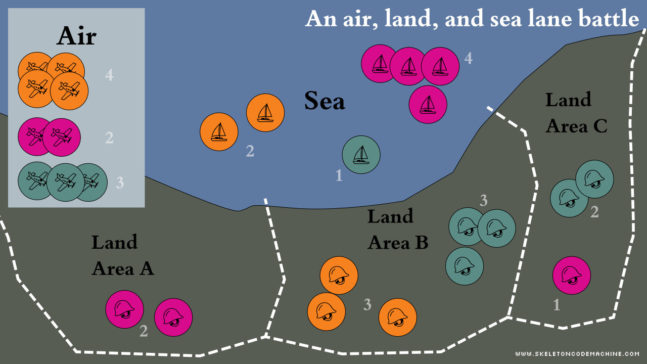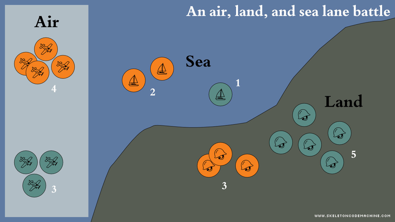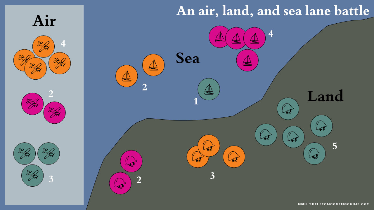 Now it looks even less like a lane battler and more like a classic “troops on a map” area control game. This is a three-way battle across three lanes. In this example, Orange wins Air, Pink wins Sea, and Green wins Land. Again, the tokens are shown as being all the same, but they could be different and each have their own special abilities.