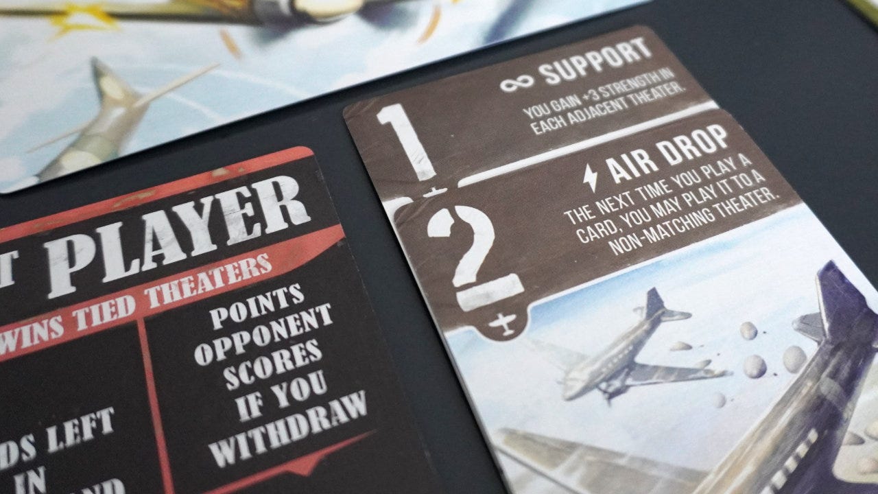 The ability to withdraw during a battle is really interesting. If you know you aren’t going to win control of enough theaters, you can just give up and concede the battle (i.e. withdraw). Your opponent wins points, but not as many as they would have if you had run the battle to its full conclusion. Instead of 6 VP, they might only get 2-4 VP depending on how many cards you have left in your hand when you gave up. It’s a clever way to turn garbage time into an interesting choice.