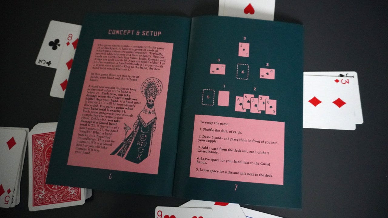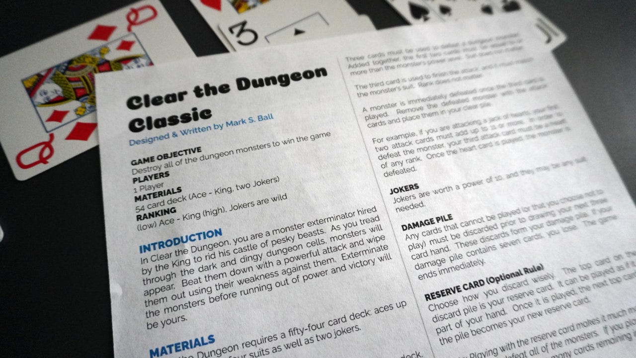 Clear the Dungeon (Ball, 2019) is a solitaire card game that fits in into the same genre as the example above, but with a theme.3 The player is fighting monsters in a dungeon, attempting to defeat them all. Granted, it’s not much of a theme, but it does exist.