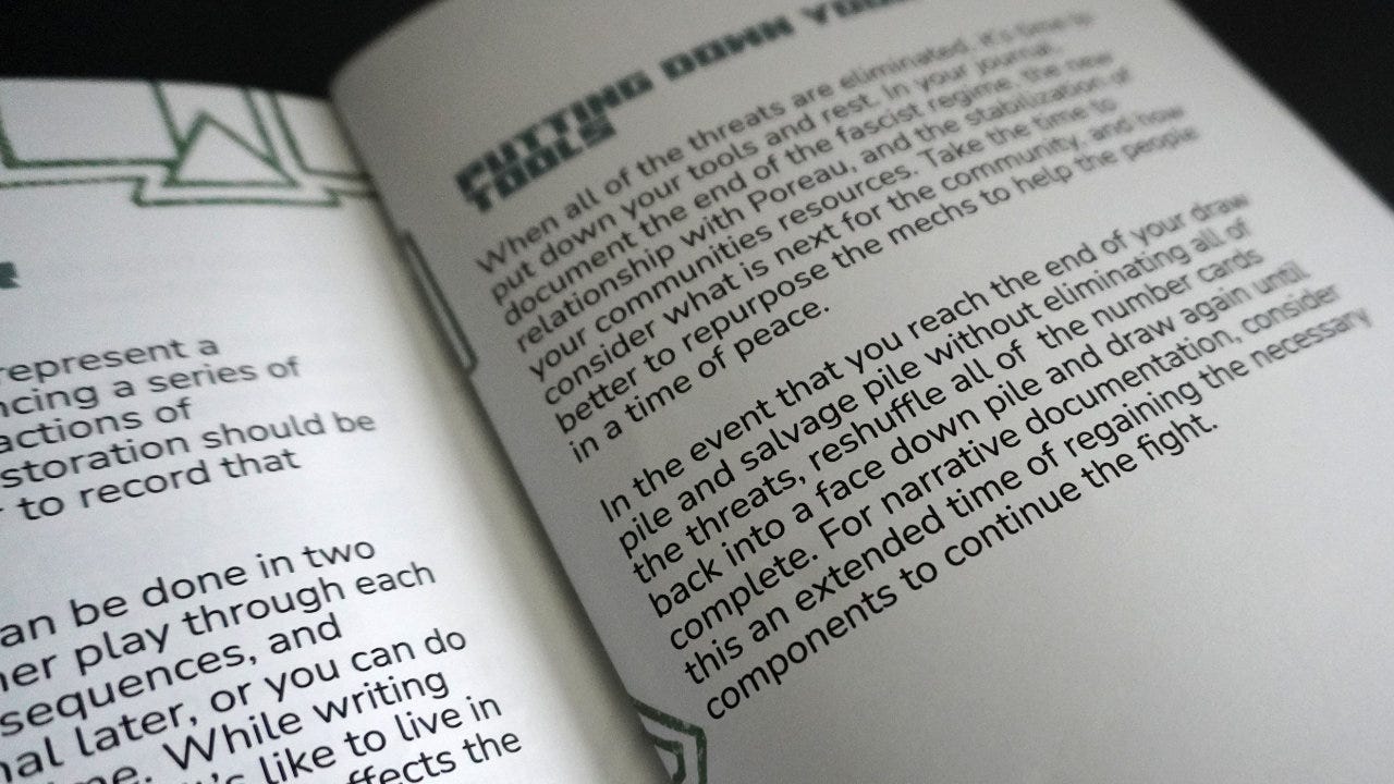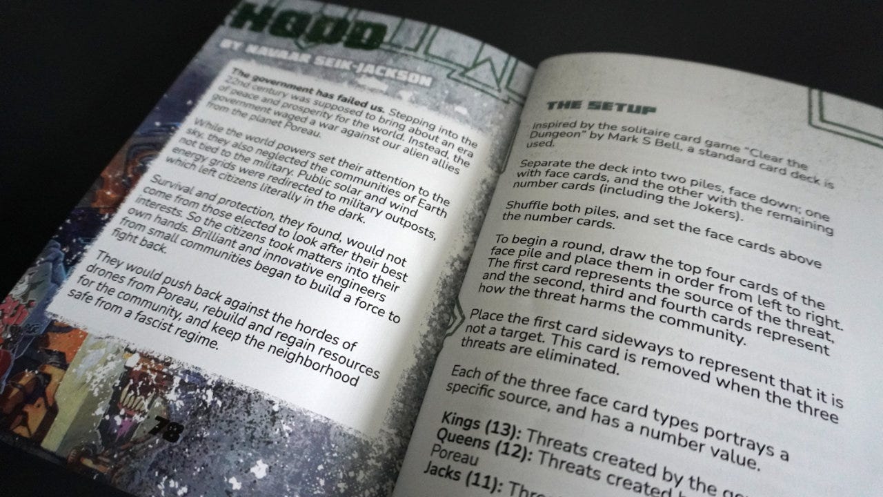 Returning to the Griot anthology, Neighborhood Robots by Navaar Seik-Jackson takes the Clear the Dungeon system (with some modifications) and turns it into a solo journaling game about “taking matters of community care, protection, and rebellion into your own hands.”