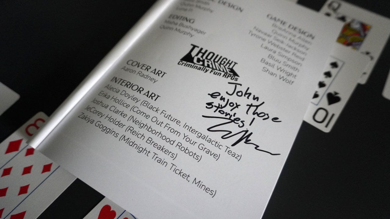 I picked up a copy of Griot Anthology by Thoughtcrime Games at PAX Unplugged last year.1 Edited by Misha Bushyager and Quinn Murphy, it is a compilation of seven tabletop roleplaying games: