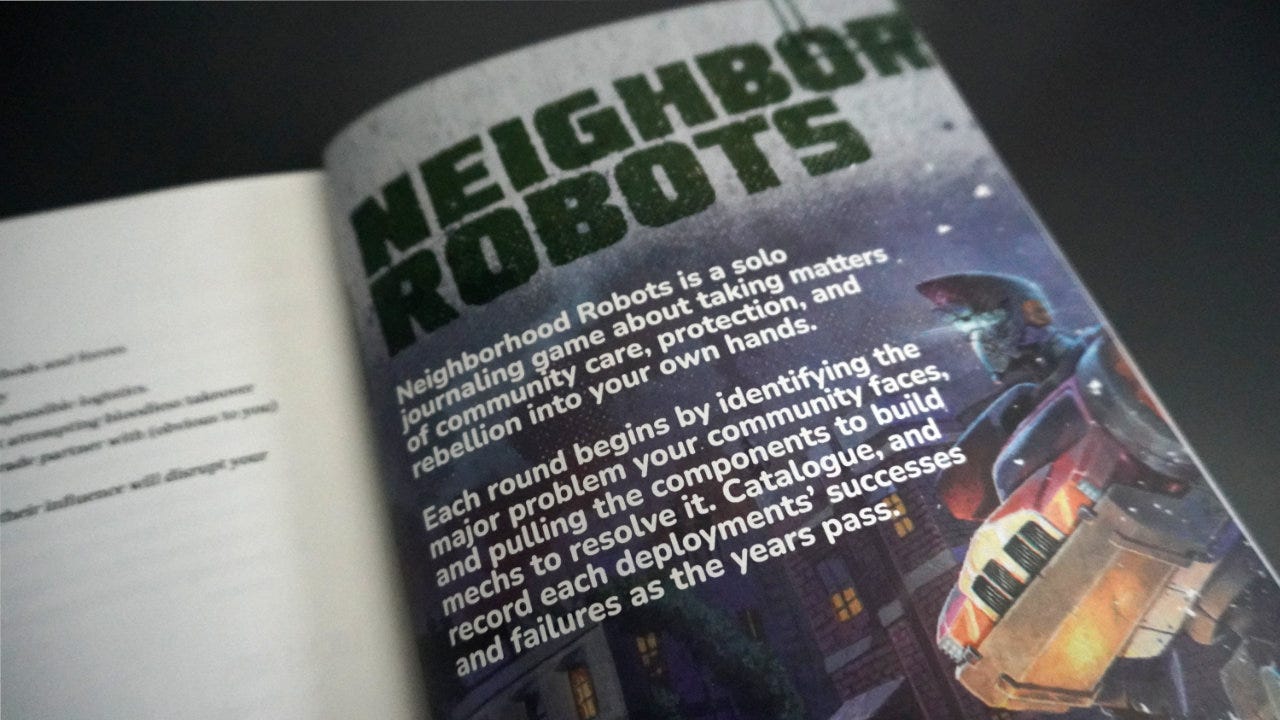 Neighborhood Robots caught my attention because it is a solo journaling game, has an interestingly mechanical structure, and includes big stompy mechs.
