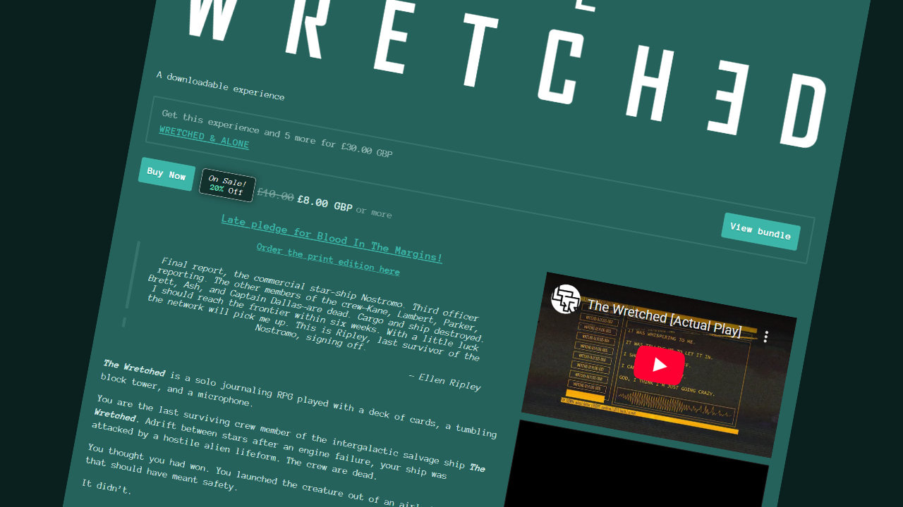 The Wretched by Chris Bissette was an important game in my introduction to solo TTRPGs.5 It’s a tense game with an Alien-esque space horror theme: