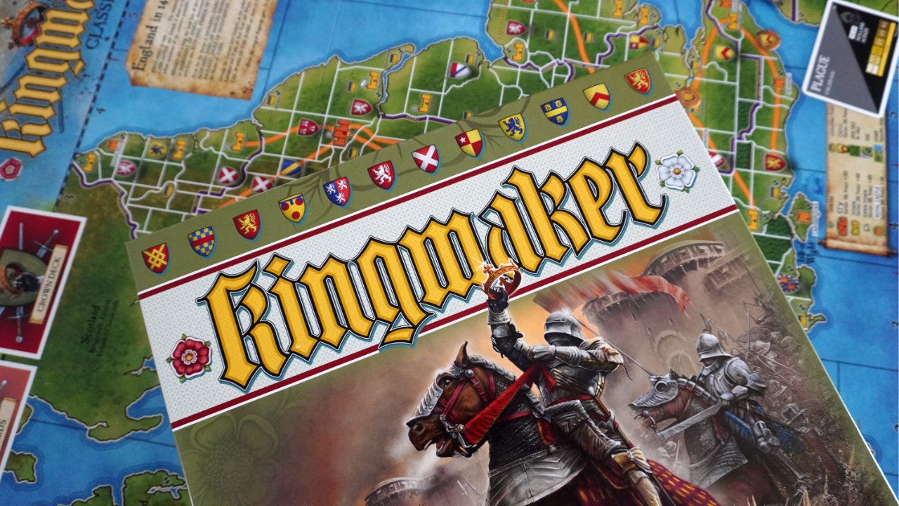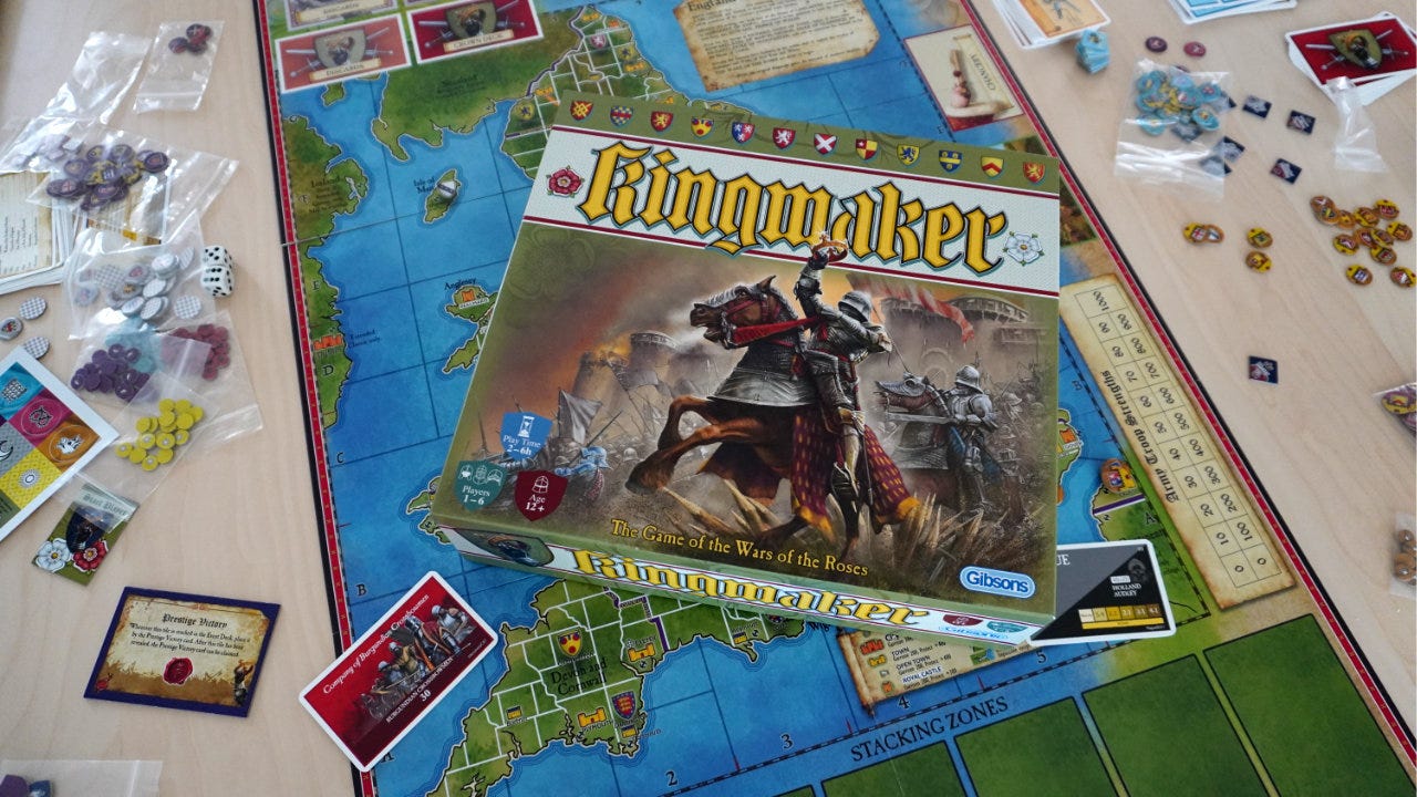 I had the wonderful opportunity to play the original Kingmaker (McNeil, 1974) recently, and haven’t stopped thinking about it since. To understand why, we’ll need to go over a little about how the game works.1