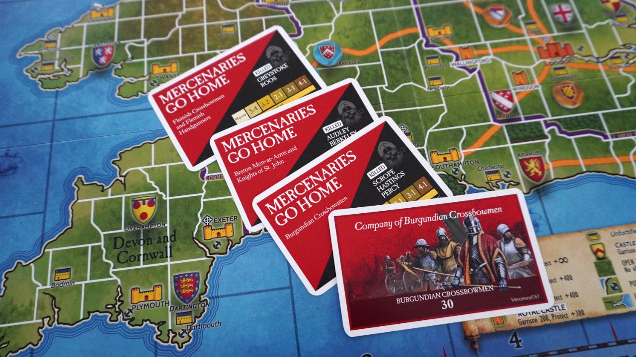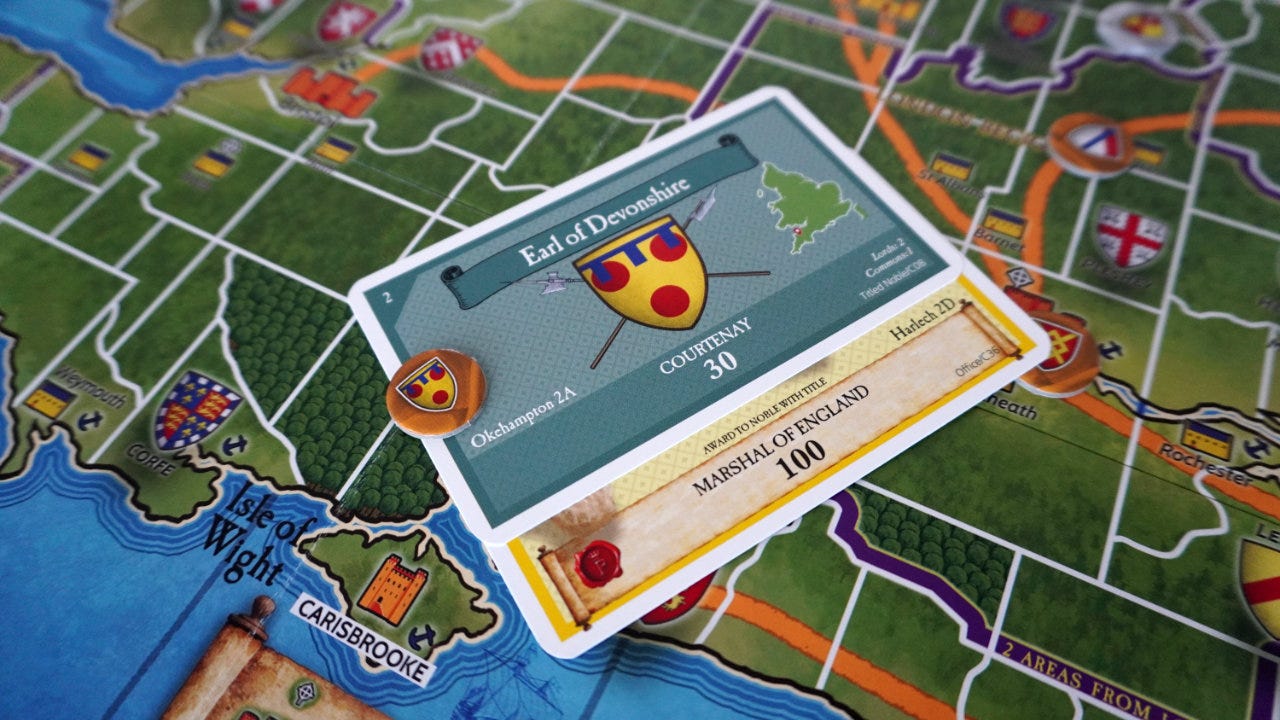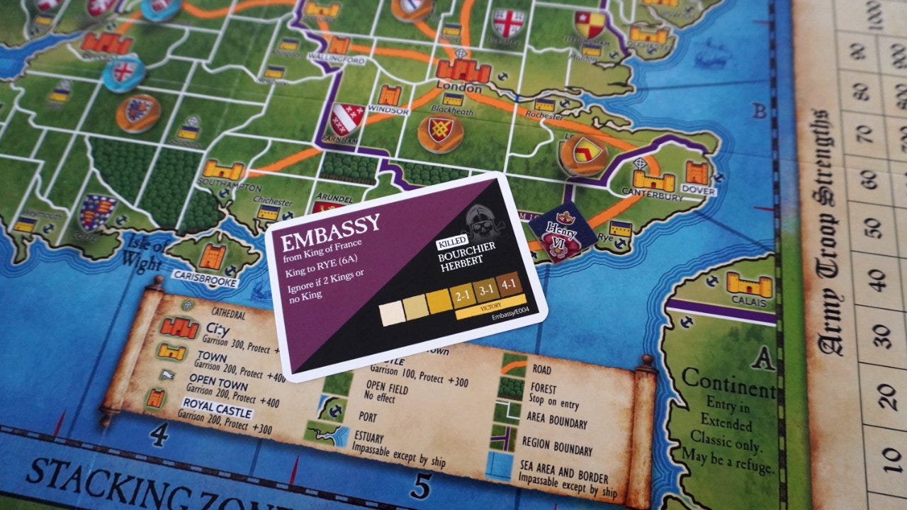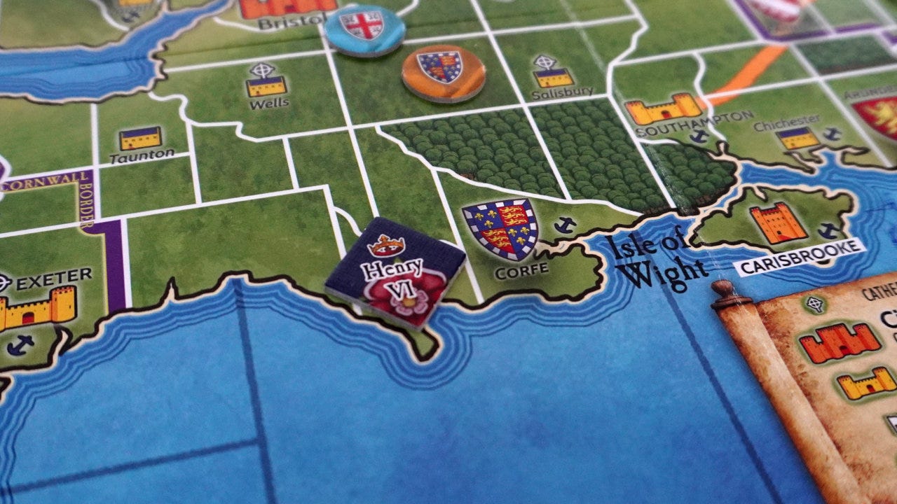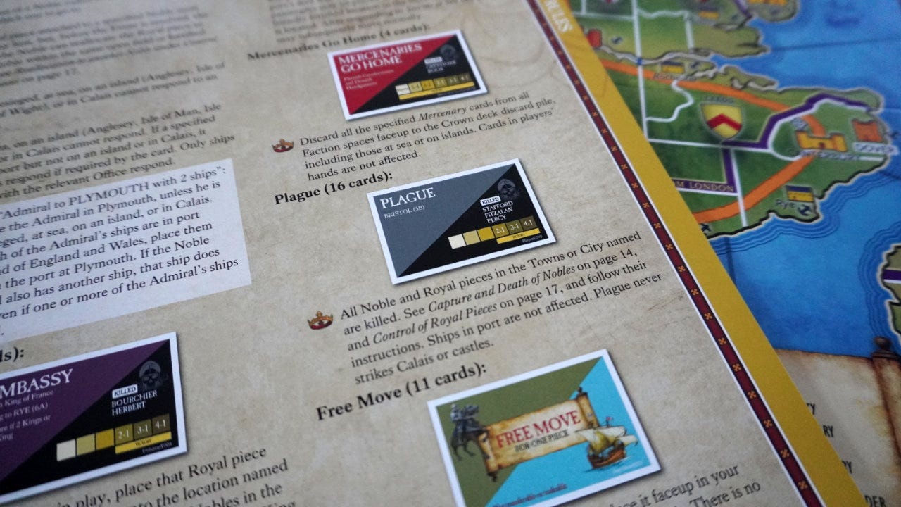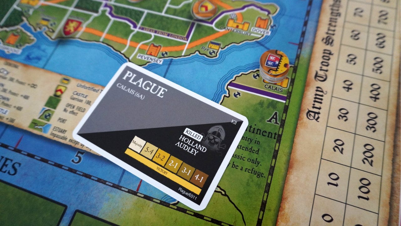 In fact, our game played out in a related way. King Henry VI was randomly sent to Weymouth, making it easy for me to capture him with Beufort who starts the game right next door. The king was later called to Rye, yanking him out of the defense I’d built. Eventually, with just the king and one competing heir left, I slipped across the water to Calais… only to have a plague strike. Killing my armies, the king, and ending the game as a loss for me and a win for someone else.