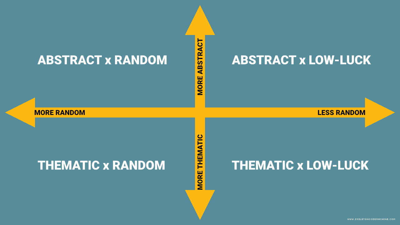 A model of randomness and theme would be helpful. We can build a quadrant chart with random vs. low-luck (i.e. limited randomness) on one axis and thematic vs. abstract on the other:
