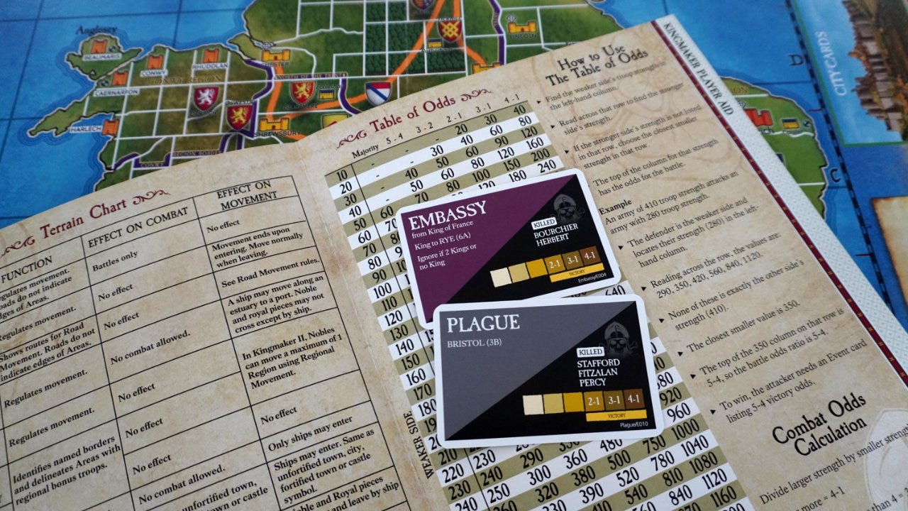 Mitigation and planning are important: Kingmaker works because the contents of the event deck, however large, is known — Mowbray commands a large force but will be dragged all over the map. The onslaught of disasters in The Wars of Marcus Aurelius are fun because you can react to them and change your plans accordingly.