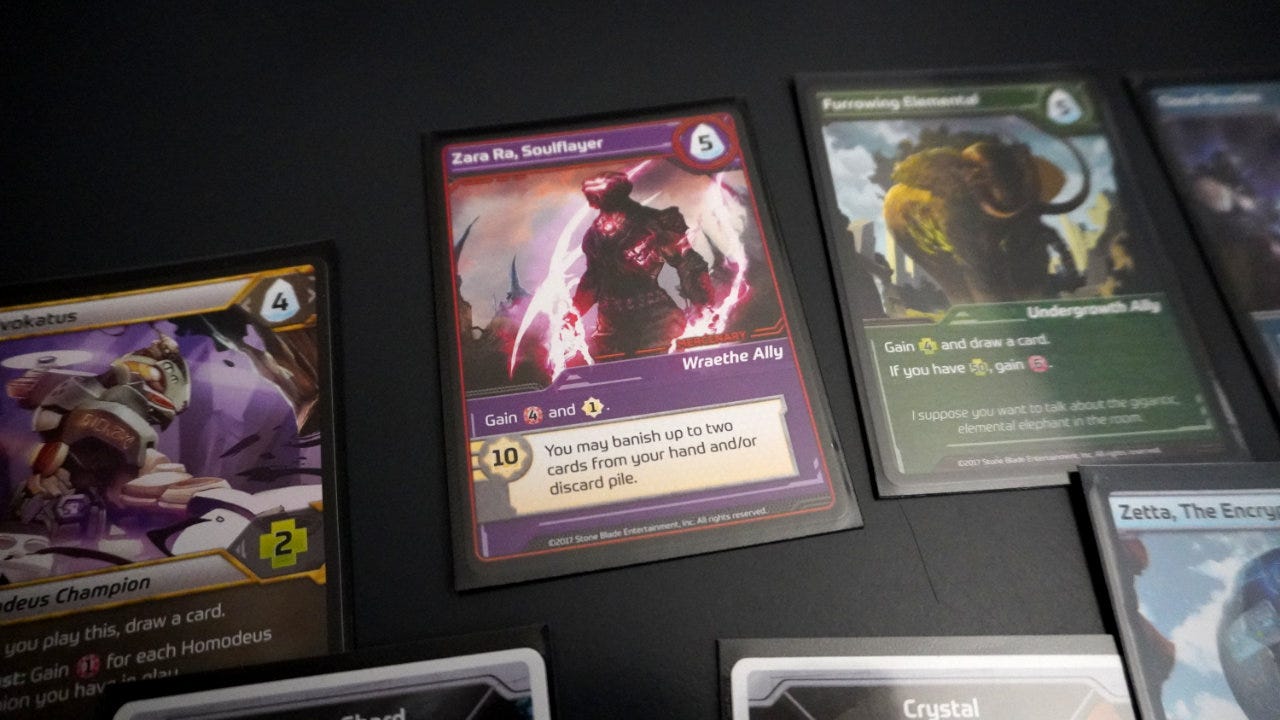 Ally cards are the most common type of card. They have a name, cost (in Gems), faction, and effect when played. For example, the Shardwood Guardian is a member of the Undergrowth faction and causes the player to gain 2 Power and draw a card. Zara Ra, Soulflayer has the player gain 4 Power and 1 Mastery, but at a Mastery level of 10 it also allows two cards to be trashed out of the player’s deck.