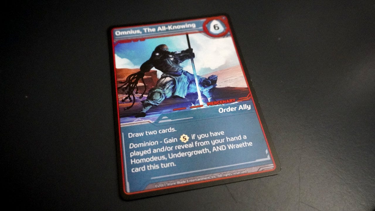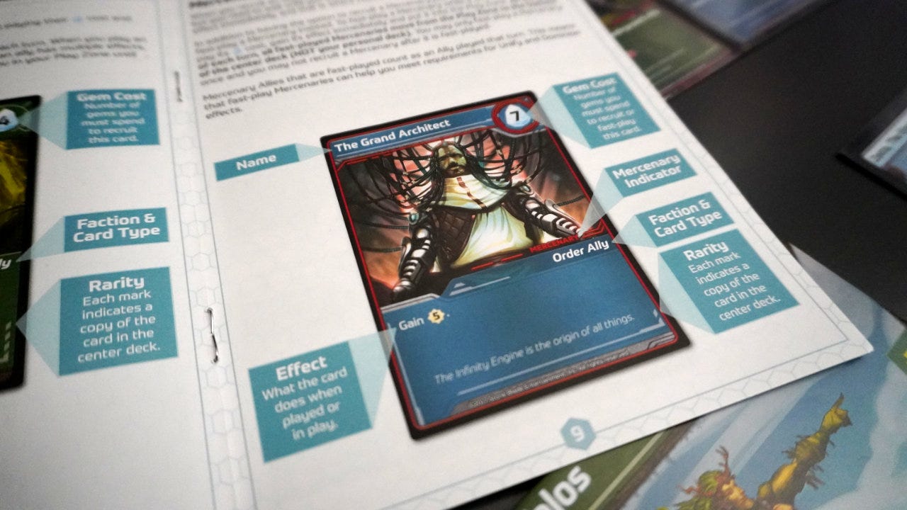 Considering deck-building is one of my favorite board game mechanisms, I’ve surprisingly never directly covered it in a Skeleton Code Machine article.2 That changes today! We will be exploring how Shards of Infinity (a deck-builder) uses red-bordered mercenary cards to add more options during play.