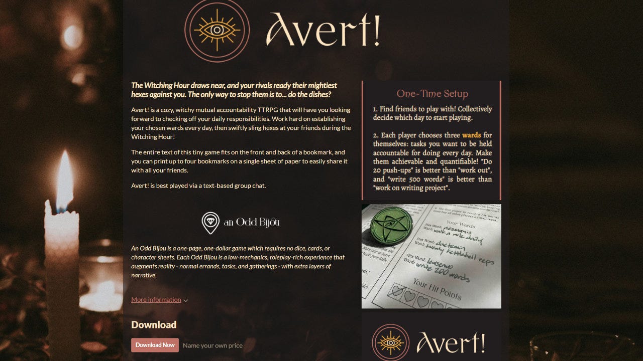 Showing just how much game can fit into a bookmark, Avert! by S. Kaiya J. is a bookmark game about “mutual accountability and hexing your friends.”