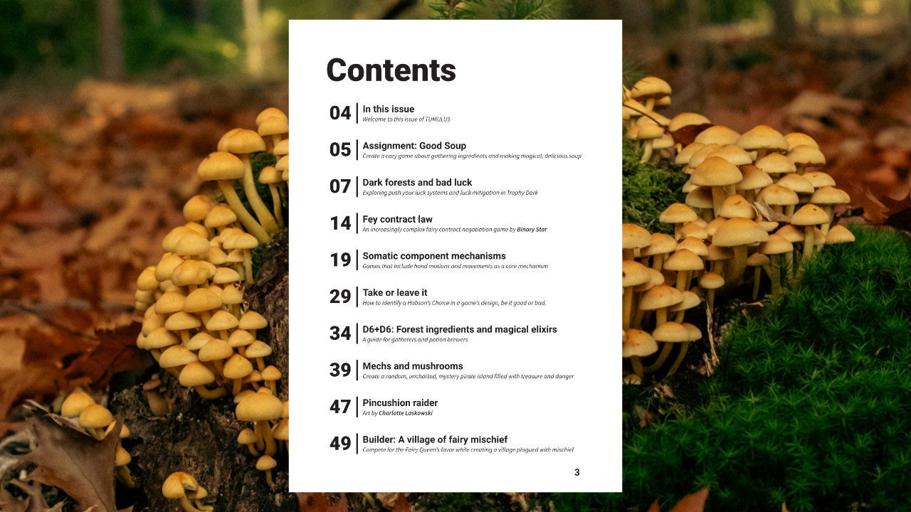 TUMULUS is a quarterly compendium of analog gaming inspiration, tools, design theory, and playable content from the award-winning Skeleton Code Machine. Each issue explores a different theme, with articles, games, random tables, and art interpreting that theme in unique ways.
